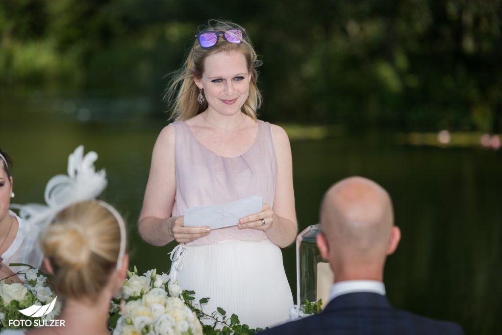 Die standesamtliche Trauung kann am Winterstellgut direkt vor Ort an einem attraktiven Naturteich stattfinden. Bei strahlendem Sonnenschein hatten Nina und Jürgen eine emotionale Trauung. Während der Trauung hatte ich die Gelegenheit, auch von der gegenüberliegenden Seite des Teichs die ganze Zeremonie zu zeigen. Die meiste Zeit allerdings war ich mit dem Paar und seinen Trauzeugen auf dem Steg und versuchte erfolgreich mit der längstmöglichen Brennweite nicht ins Wasser zu fallen 😉